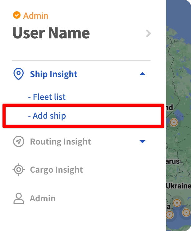 메뉴에서 Ship Insight 클릭, Add ship을 클릭합니다.