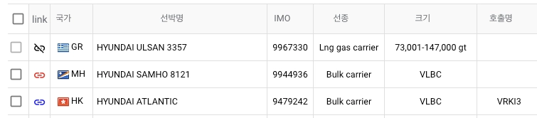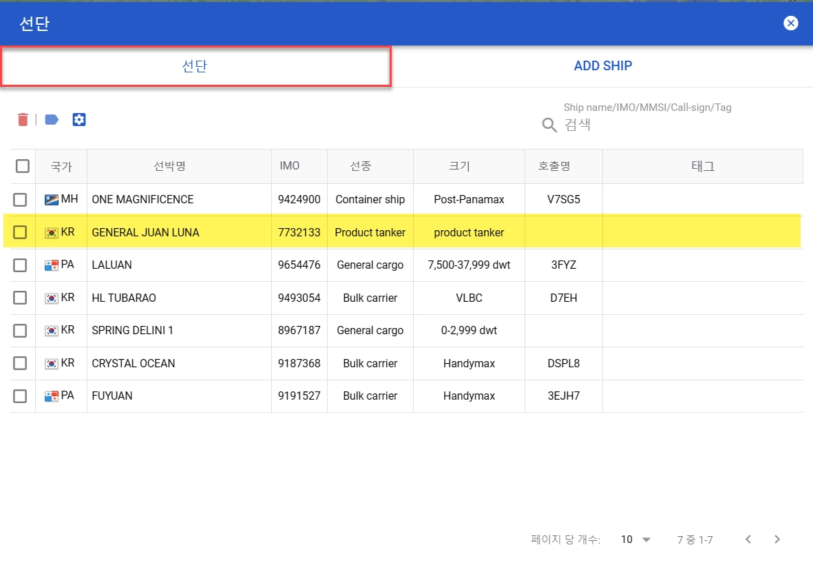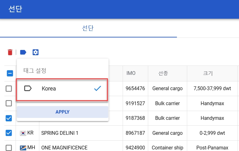 선박들을 체크한 뒤 태그 설정 버튼을 클릭합니다.