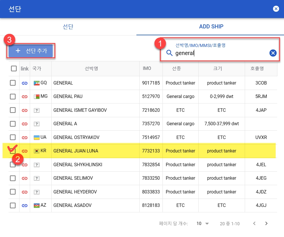 Add ship 화면에서 ①선박명 검색, ②추가하고자 하는 선박 체크 ③선단 추가 버튼을 클릭합니다.