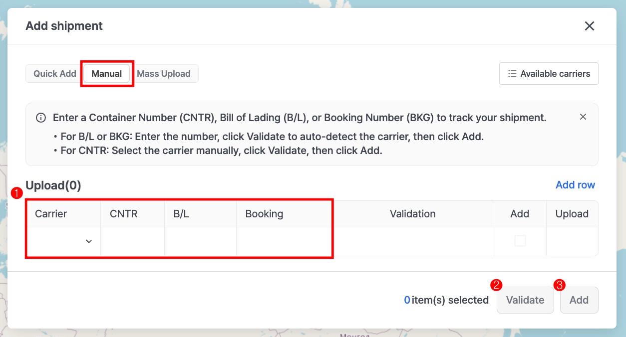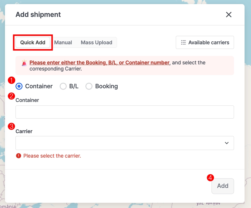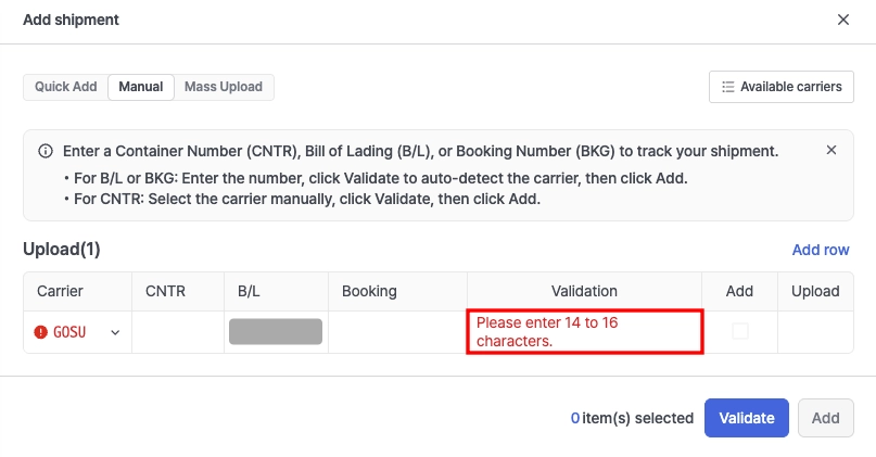 Container 번호로 등록할 경우 Carrier Code를 반드시 직접 입력