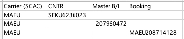 Carrier Code와 Container / B/L / Booking No 중 하나 입력
