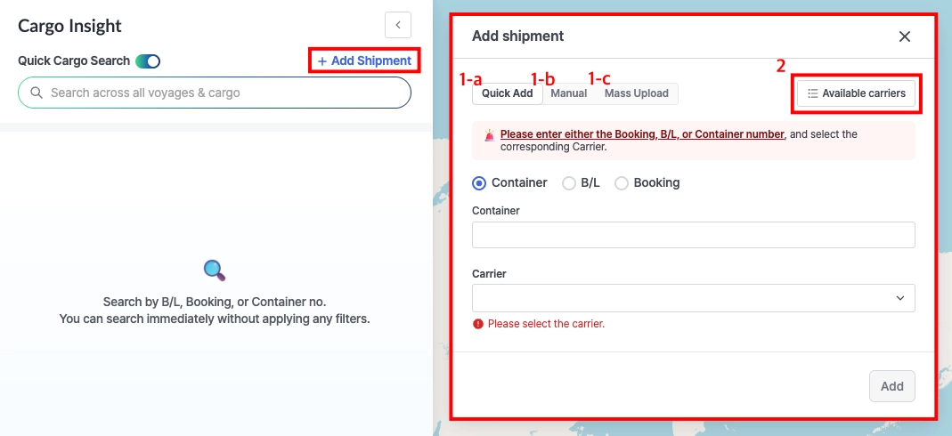 Cargo Insight 페이지에서 오른쪽 사이드 패널 우측 상단의 [+ Add Shipment] 버튼을 클릭하면,