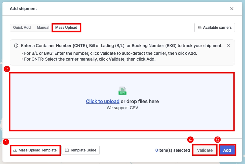 선사별 Carrier Code는 팝업창 오른쪽 상단에 있는 ‘Available Carriers’ 버튼을 클릭하여 확인
