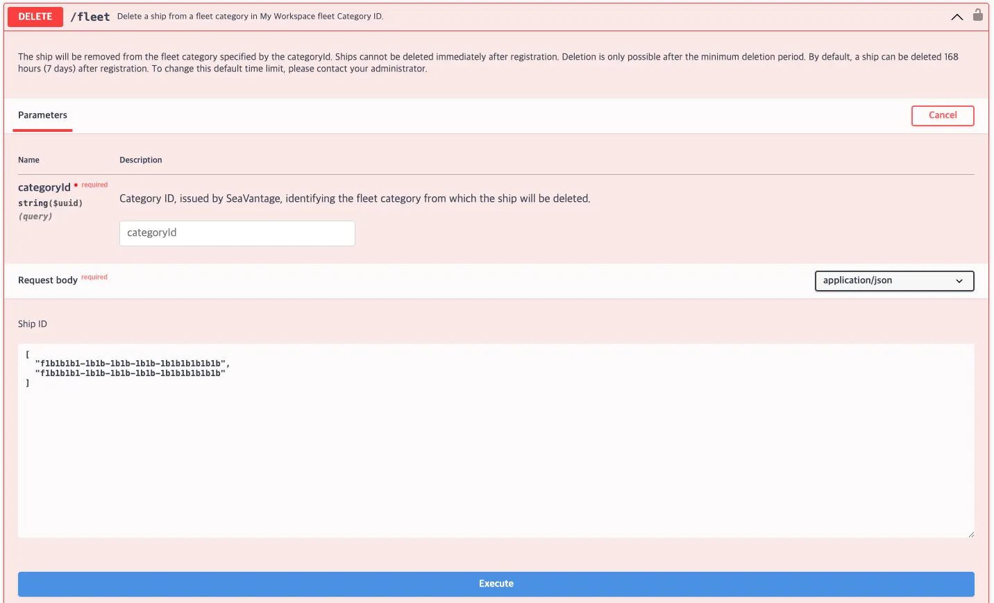 이 API는 등록된 선박(ship)을 특정 카테고리(categoryId)에서 삭제하는 기능을 제공합니다. 단, 등록 직후 즉시 삭제는 불가능하며, 기본적으로 등록 후 7일이 경과해야 삭제할 수 있습니다.
