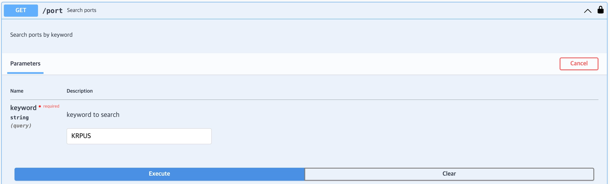 이 API는 UNLOCODE, 항구명, 항구별칭을 이용하여 항구(Port)를 검색하는 기능을 제공합니다. 사용자는 항구 이름의 일부 또는 전체 키워드를 입력하여 조건에 맞는 항구 정보를 조회할 수 있습니다.