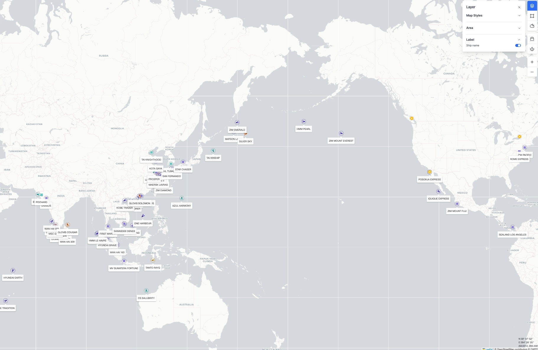 화면 우측 상단의 [Layer] → [Label > Ship name] 토글을 활성화하면 지도 위 선박 아이콘 아래에 선박명이 함께 표시됩니다.