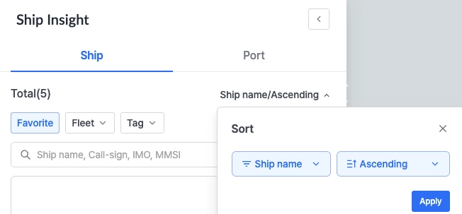 선박명(Ship Name) 기준으로 선박 리스트의 표시 순서를 정렬할 수 있습니다:
