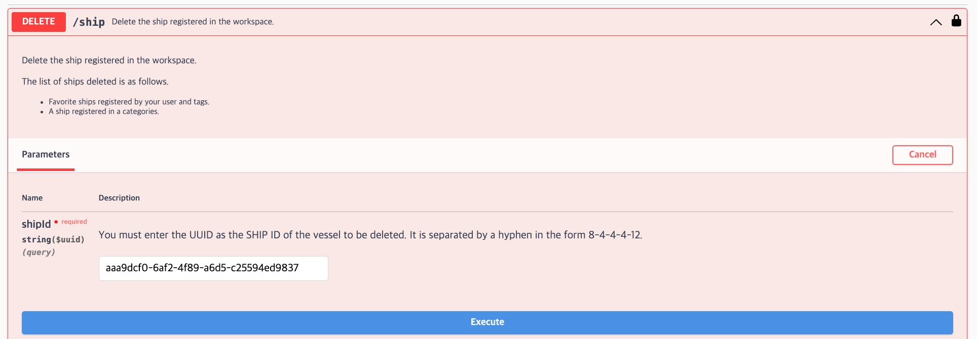 워크스페이스에 등록된 선박을 삭제하는 API입니다. 삭제 대상 선박의 범위는 사용자 계정에서 Favorite으로 등록한 선박과 특정 카테고리에 등록된 선박입니다.