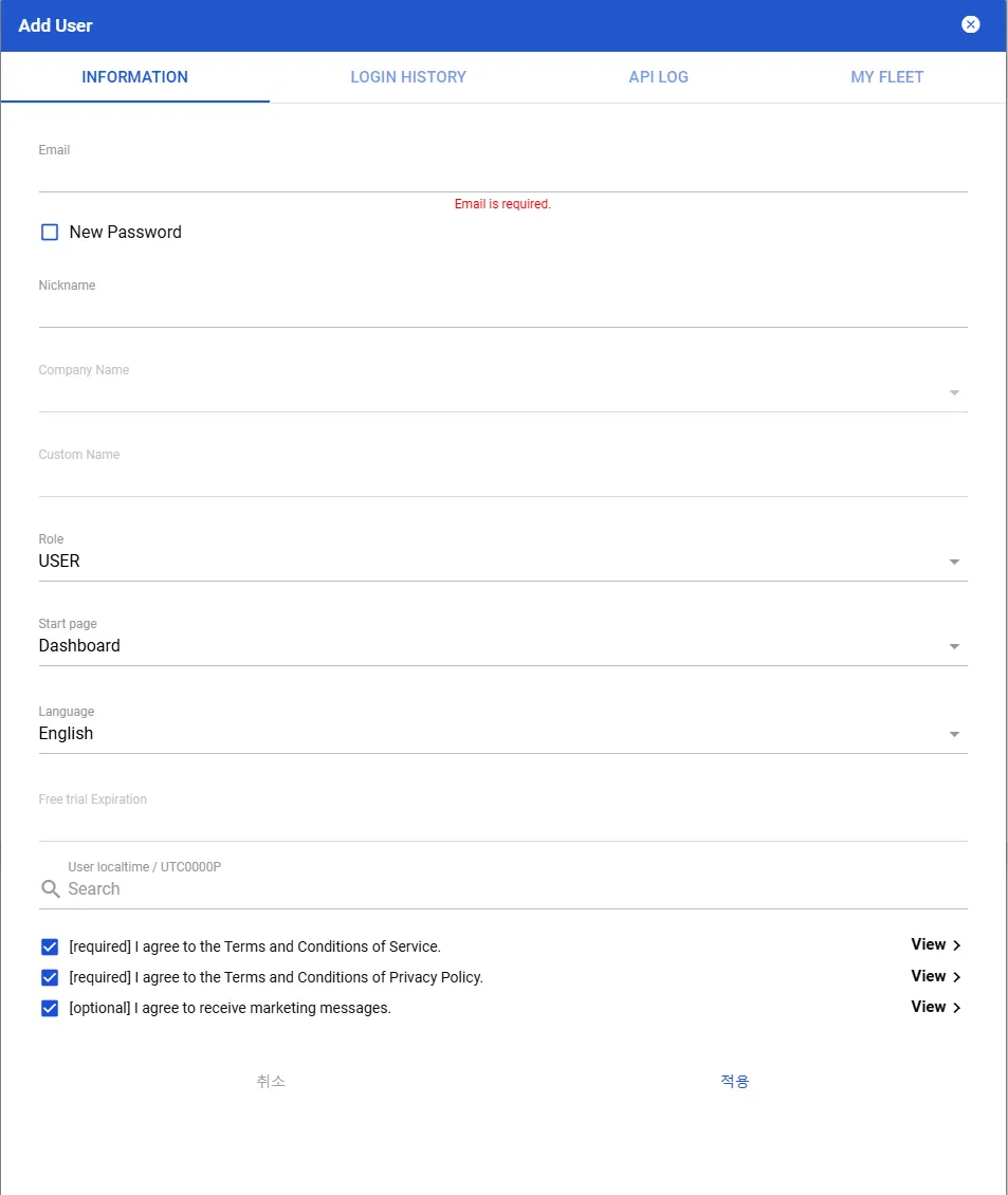 Add a user by specifying the email address, nickname, password (tick new password), role, and language to use.
