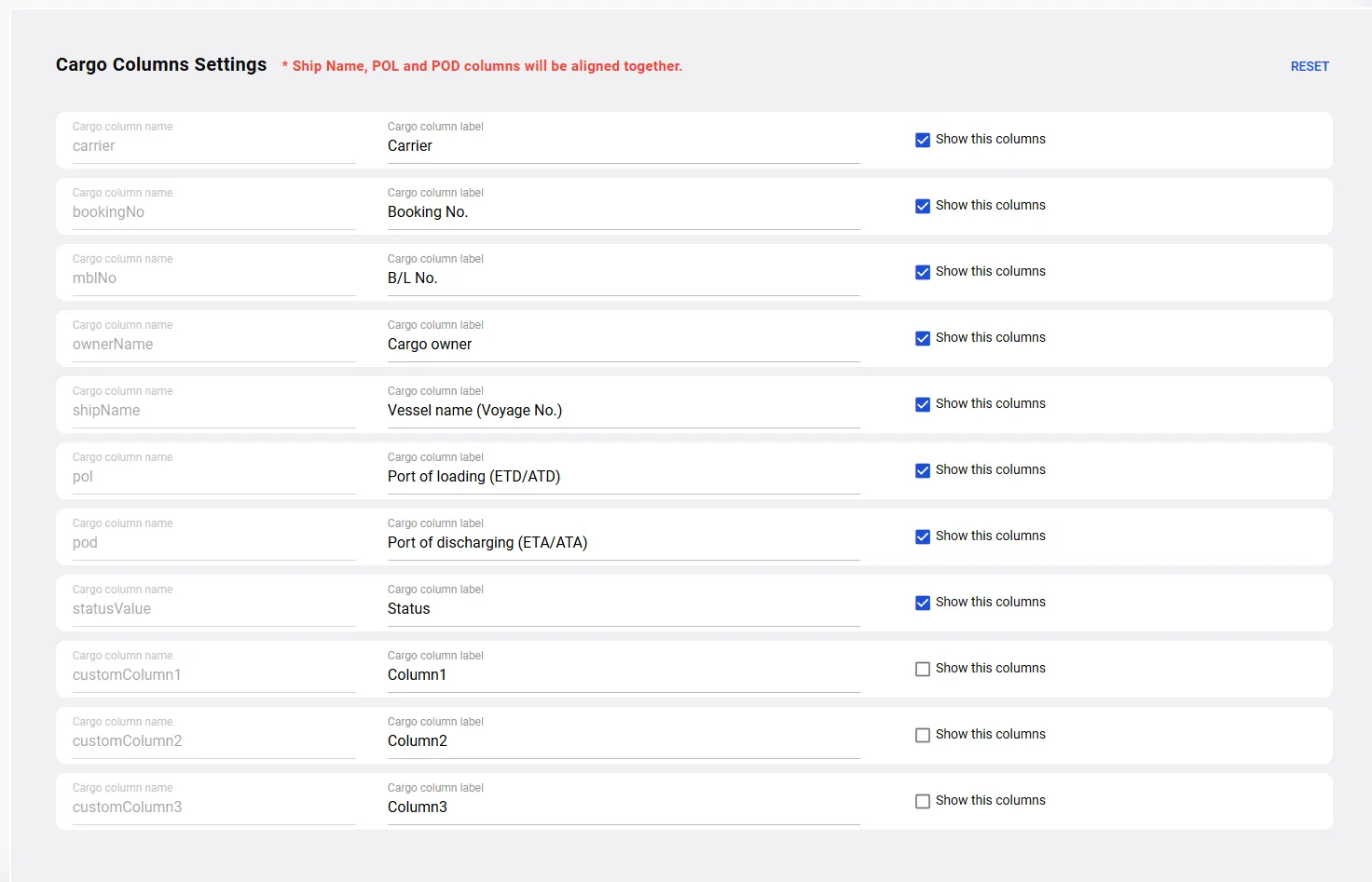 Enable custom columns that will be added to the Add B/L pop-up by ticking ‘Show this column’.