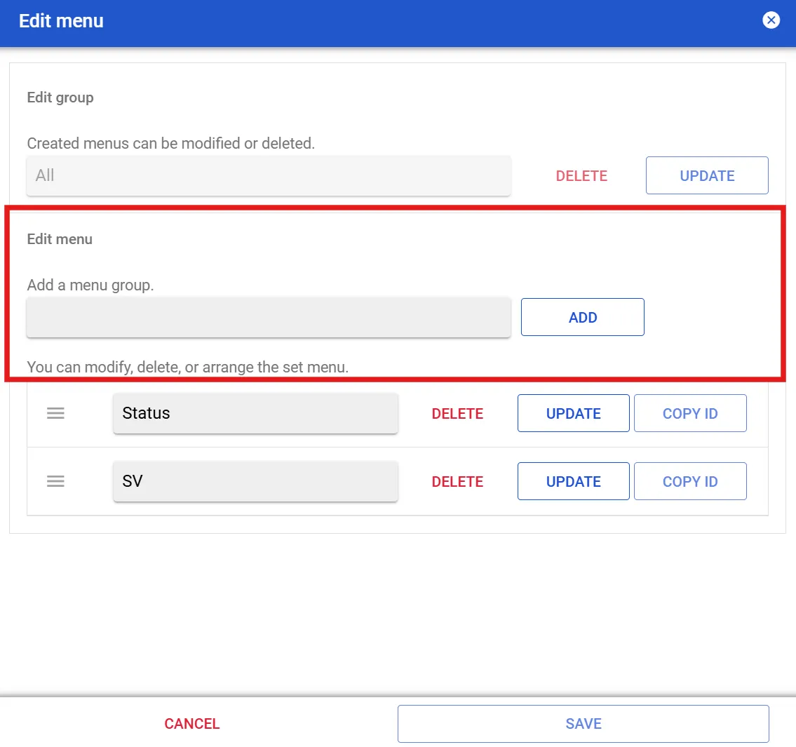 Once the ‘Edit menu’ pop-up appears, input the group name and click on the ‘Add’ button