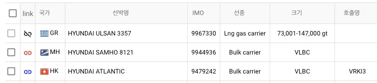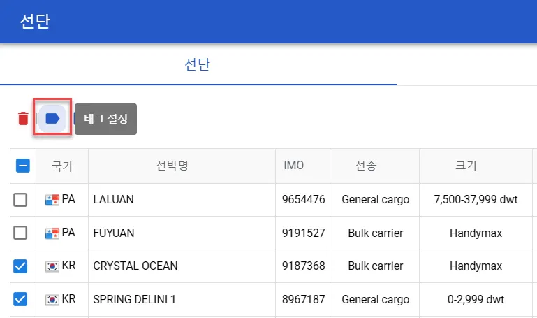 선박들을 체크한 뒤 [태그 설정 버튼]을 클릭해 태그를 설정합니다.