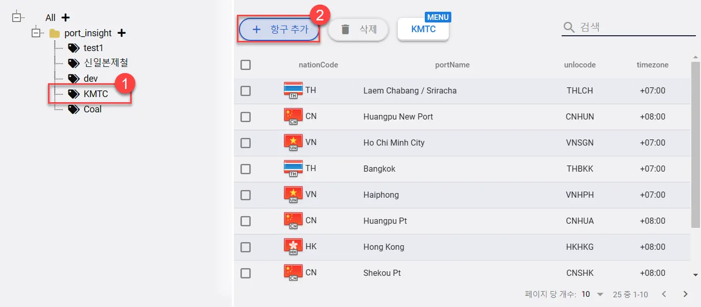 항구 메뉴 그룹에 + 추가 버튼을 클릭하여 선박을 등록합니다.