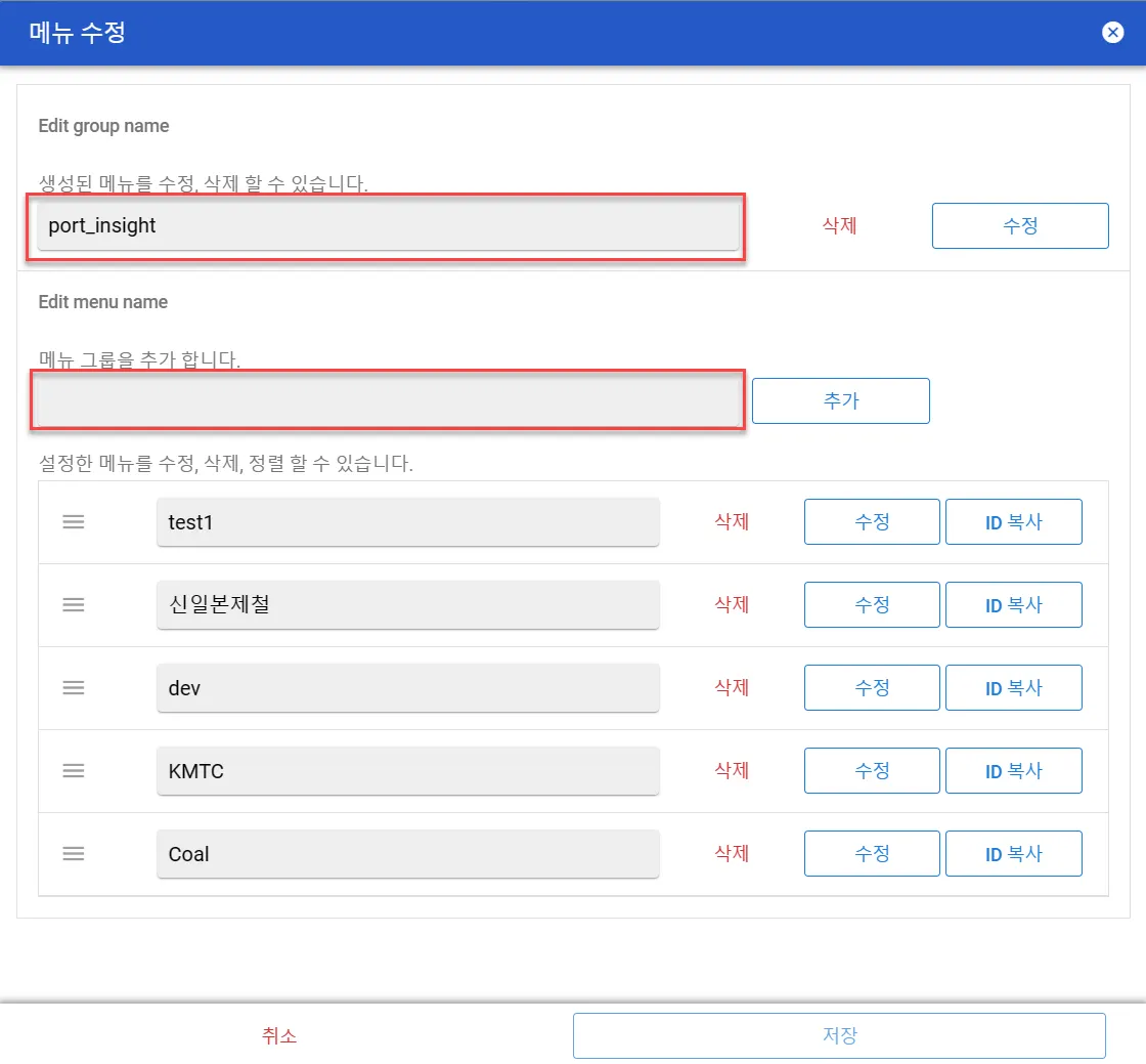 + 버튼을 클릭하여 새로운 메뉴를 만들고, 하위 메뉴 그룹을 생성합니다.