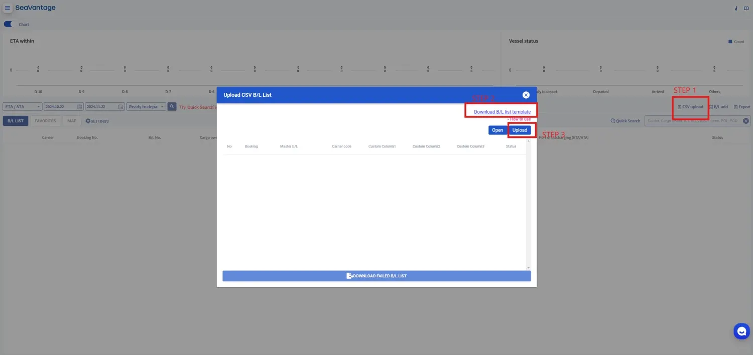 Click the B/L UPLOAD FAILED LIST DOWNLOAD button at the bottom of the pop-up window to see the list of failed B/L uploads.