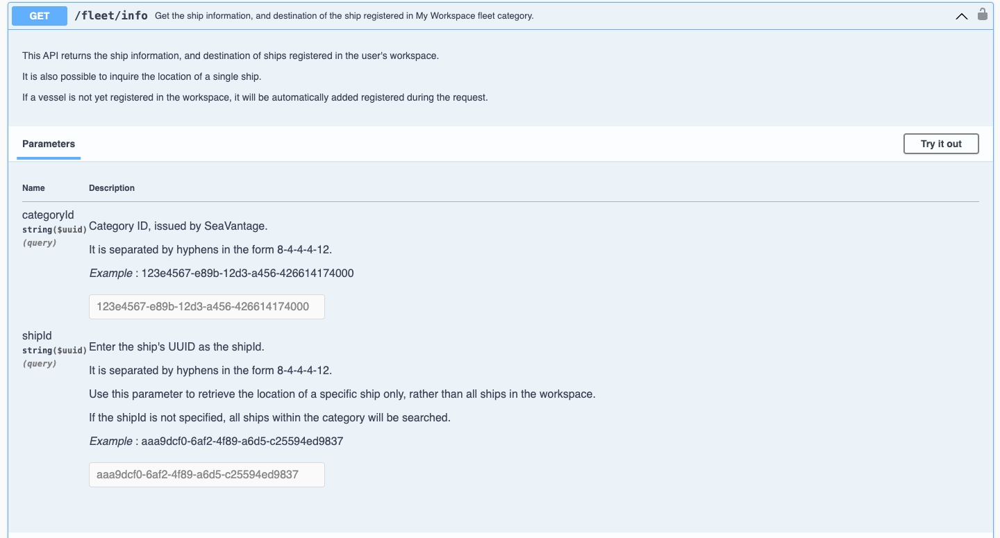 해당 API는 워크스페이스에 등록된 선박의 제원 정보와 목적지, PTA(예측 도착 시간), PTB(예측 접안 시간)를 함께 반환하며, 워크스페이스에 등록되지 않은 선박을 조회할 경우 자동으로 등록됩니다. 또한 선박이 속한 카테고리의 고유 ID 값도 함께 반환합니다. AIS 데이터를 기반으로 평균 약 15분 단위로 업데이트됩니다.