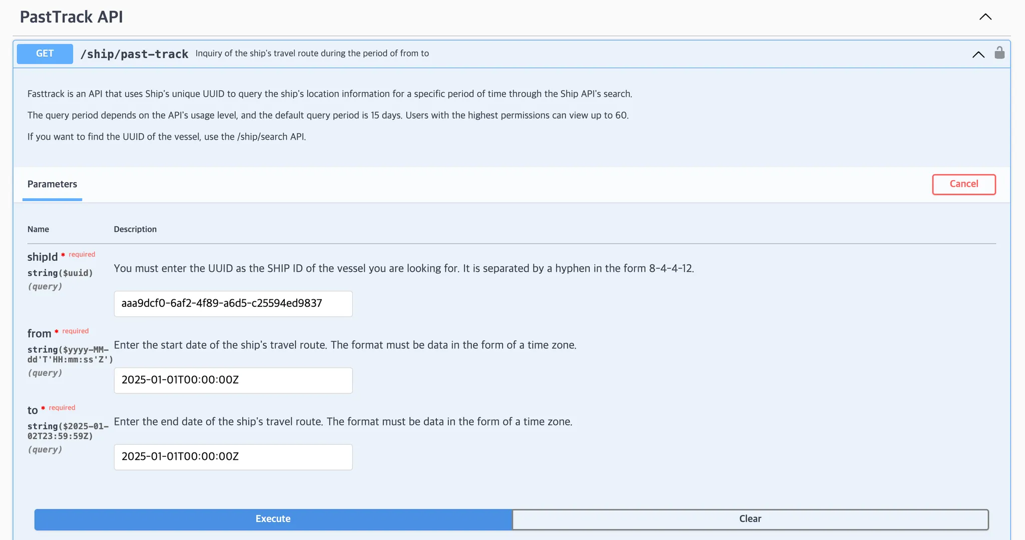 해당 API는 선박 shipId를 기반으로 지정된 기간 동안의 선박 위치 이력을 조회하며, 조회 가능 기간은 최대 60일입니다. 추가 조회 기간이 필요하신 경우 cx@seavantage.com으로 문의해 주세요.