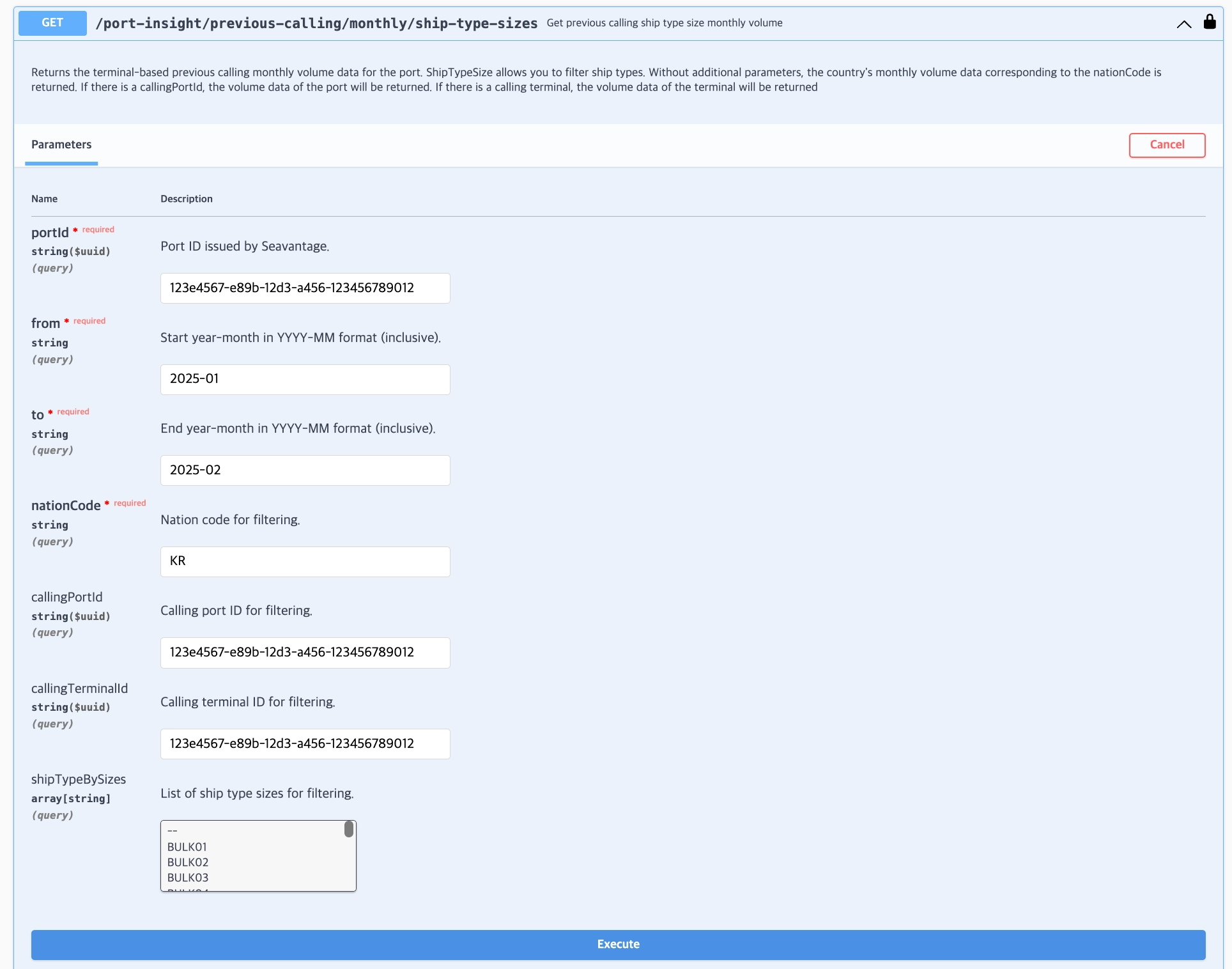 portId + from + to + shipTypeBySizes + previousCallingNationCode | 선종 사이즈 기준 → 이전 기항 국가의 선박 수 및 월별 물동량 조회 |
