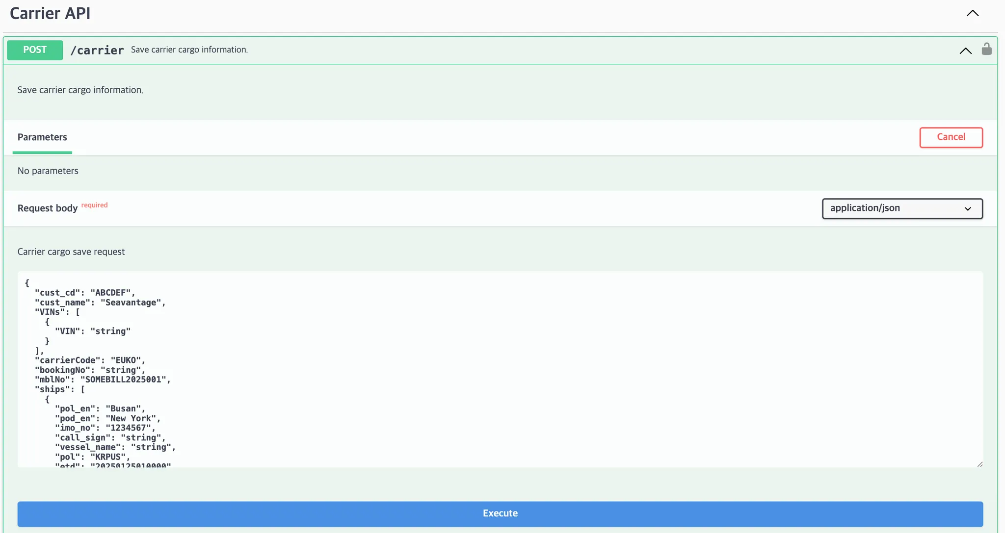 Request body: When carrier cargo information is entered, the system registers or updates the cargo details.