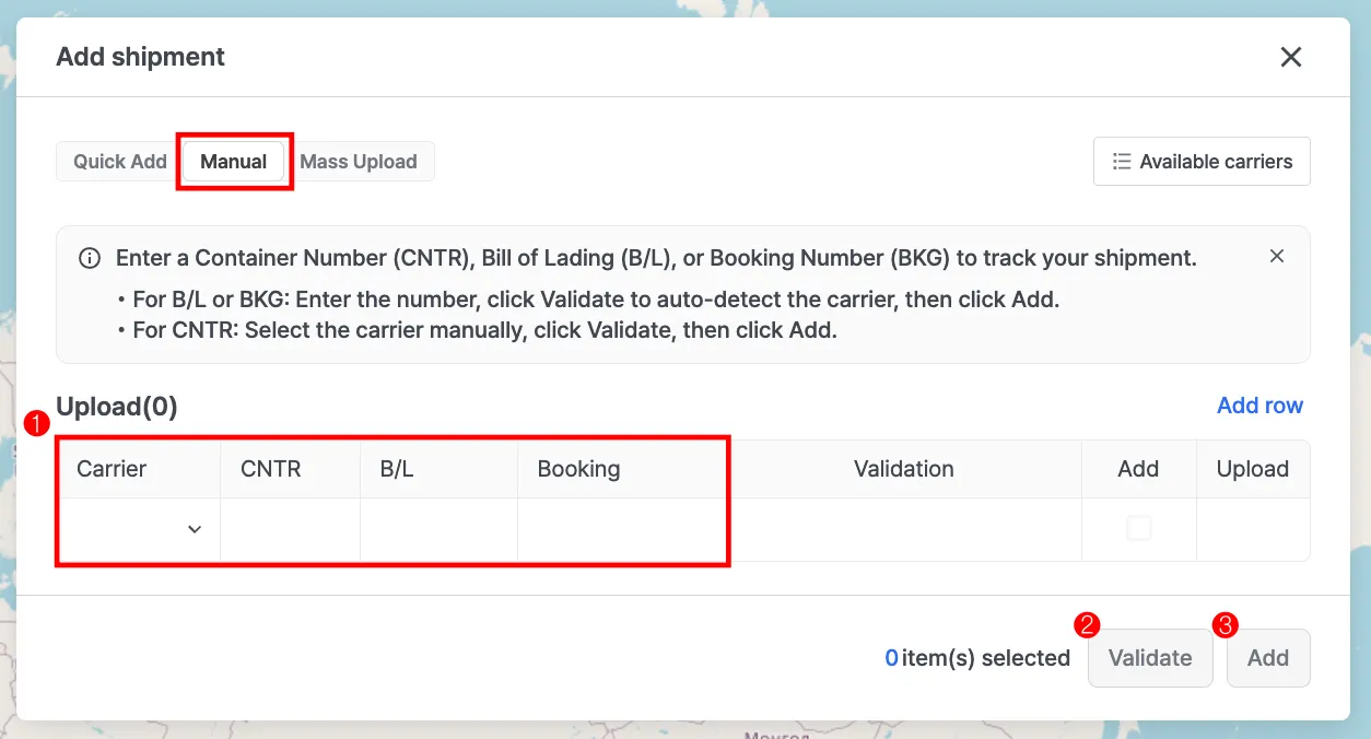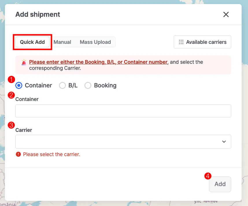 Quickly register a shipment by entering the container number, B/L number, or booking number along with the carrier code.
