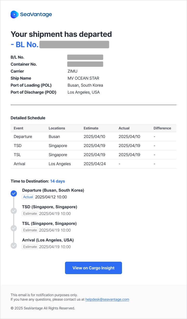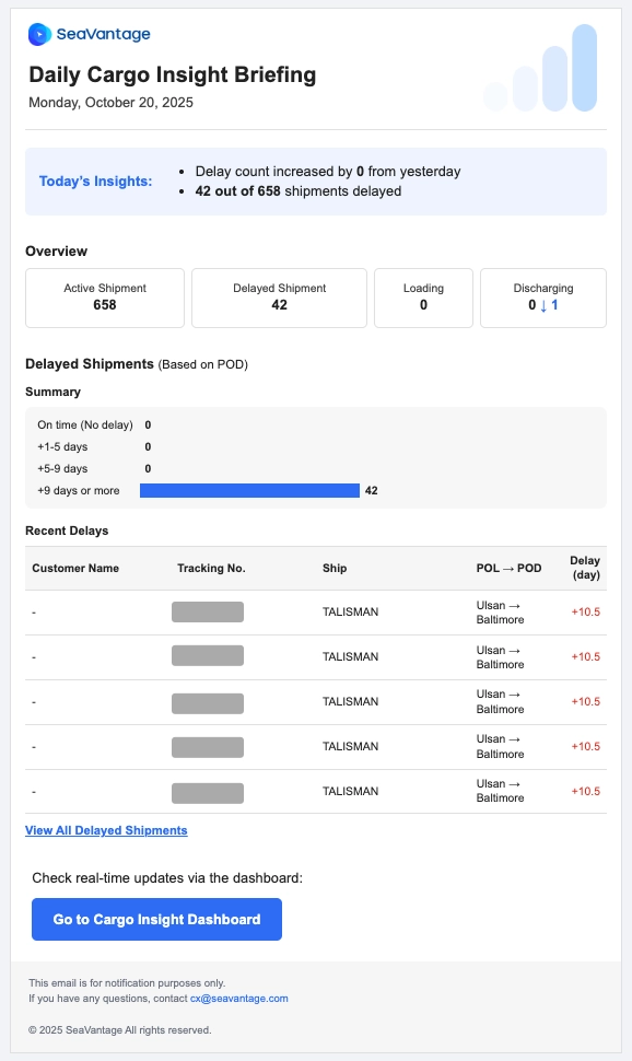 특정 화물(Shipment)에 대해 요약 정보 및 상태 변경 알림 메일을 수신할 수 있습니다.