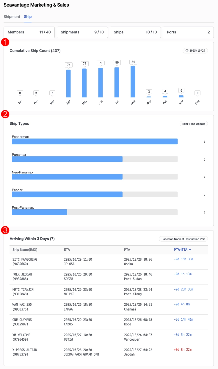워크스페이스에 등록된 선박 수를 확인할 수 있으며, 클릭하면 Ship Insight 페이지로 이동합니다.