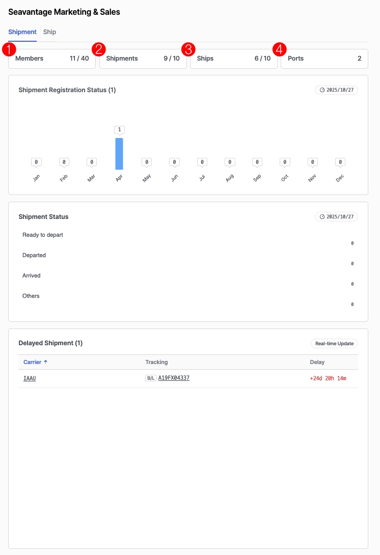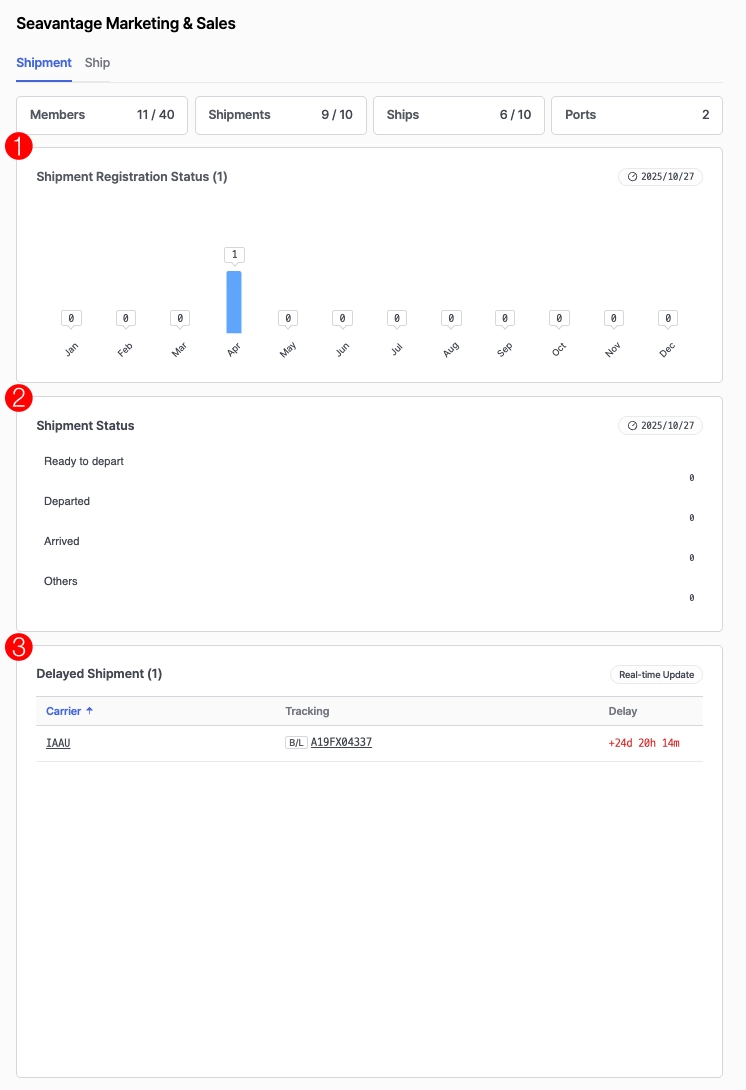 등록된 모든 선적의 상태별 선적 수를 한눈에 확인할 수 있습니다.