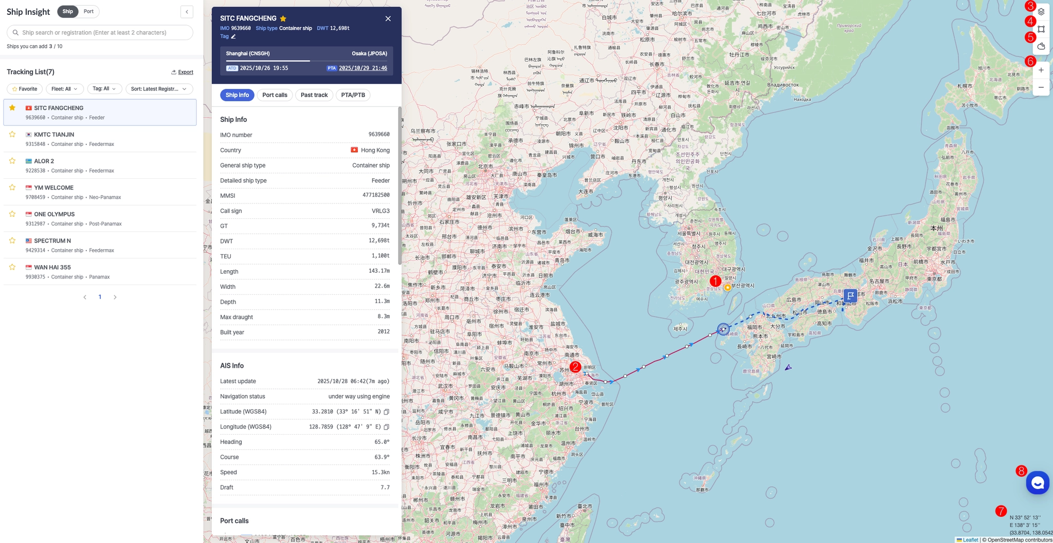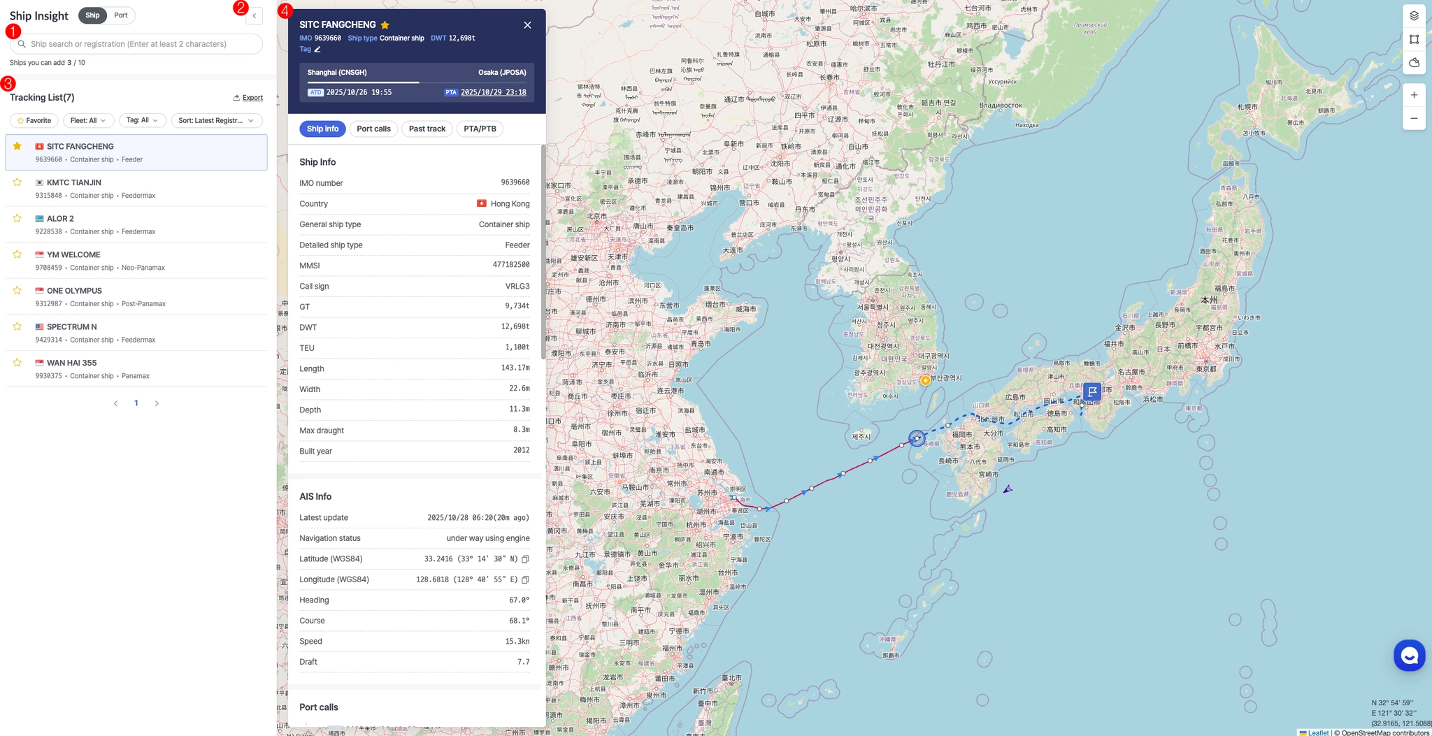 선박에 대한 상세 정보와 과거 항적, 포트콜, PTA 조회 기능을 이용할 수 있으며 선박별로 태그를 지정하여 관리 할 수 있습니다.