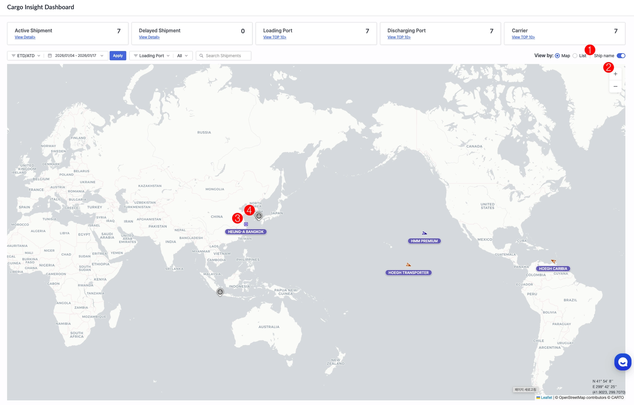 Cargo Insight에서 제공하는 선적 현황 요약 및 실시간 지도 기반 모니터링 기능을 이용하실 수 있습니다.