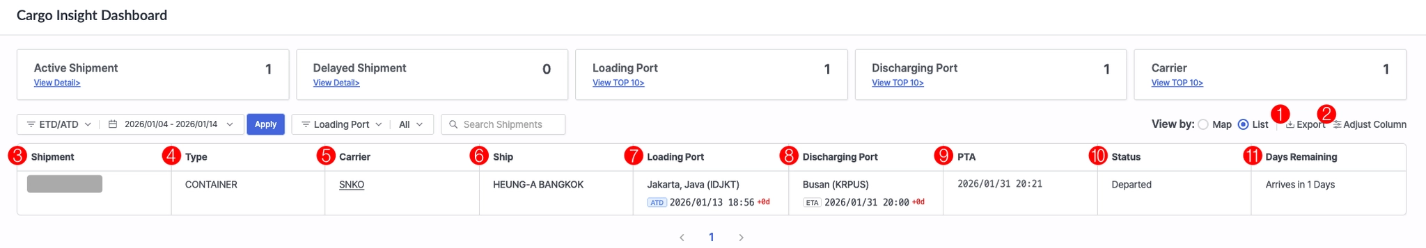 1 | Active Shipment | - 운송 중인 선적 수 표시