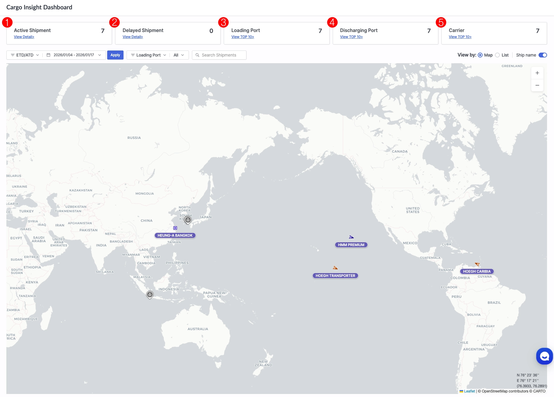 5 | Carrier | - 운송 중인 선적 기준으로 총 선사 수 표시