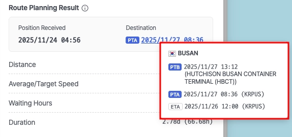 Destination : PTA 타임스탬프(timestamp) 호버 시 PTB, PTA, ETA 정보를 확인하실 수 있습니다.