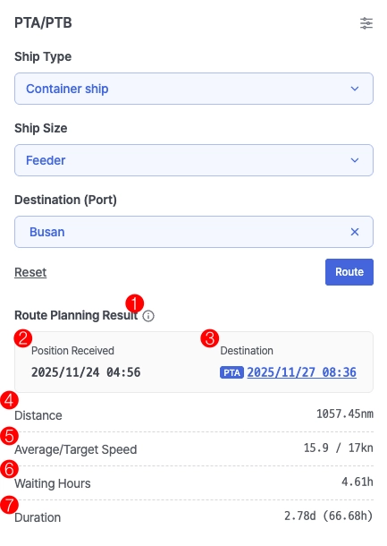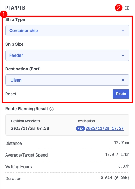 PTA/PTB 조회는 선박의 예측 도착 시간(PTA) 및 예측 접안 시간(PTB) 을 계산하기 위한