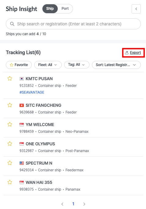 Export 버튼을 클릭하면, Tracking List의 전체 선박 목록을 엑셀 파일로 다운로드할 수 있습니다.