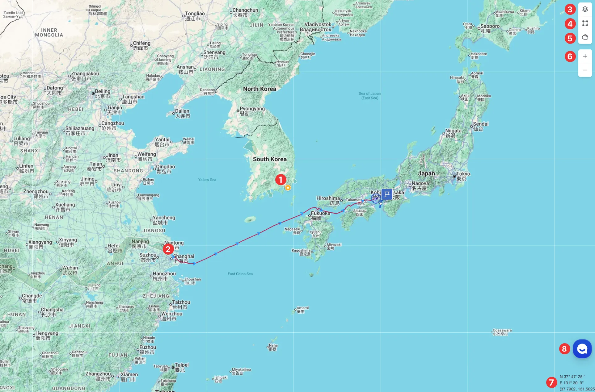 Clicking on a vessel item opens the vessel pop-up, where you can view its past route and projected route.