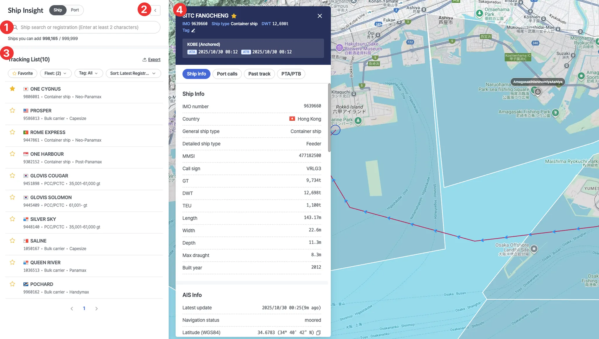 Displays detailed information about the vessel, including its past route, port calls, and PTA (Predictive Time of Arrival) data.