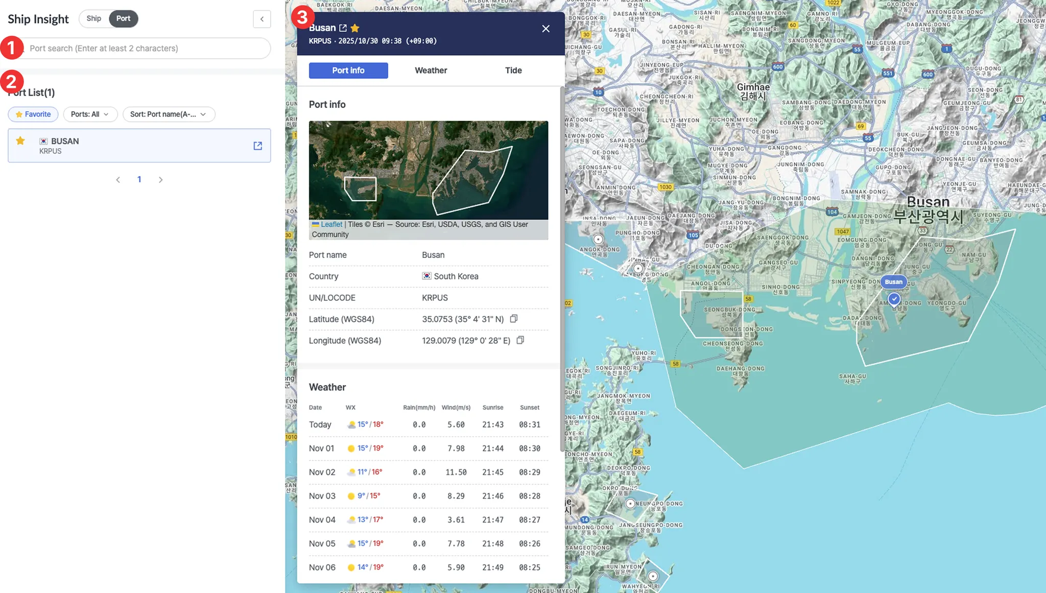 It consists of a left panel, a map view on the right, and a vessel information pop-up.