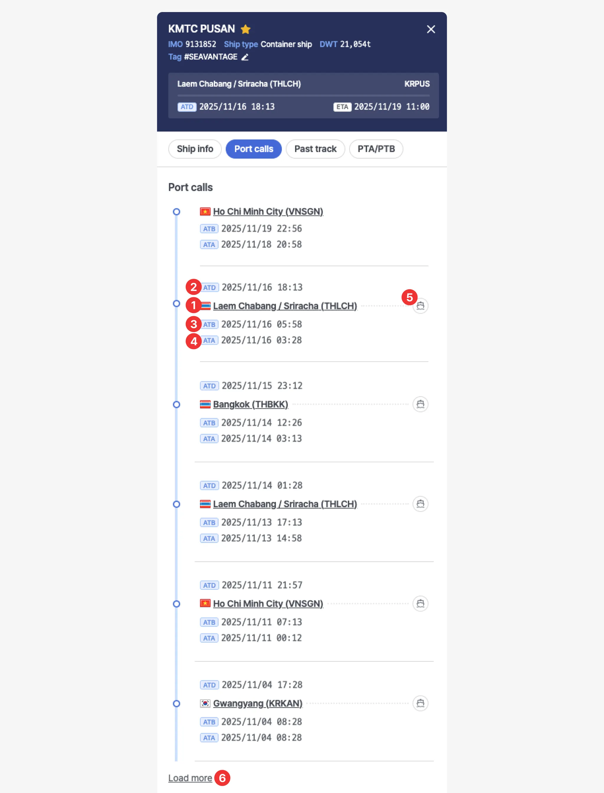 6 | Load more | Load more 버튼을 클릭하면, 현재 시점을 기준으로 과거 1년간의 선박 입출항 이력을 추가로 확인할 수 있습니다. |