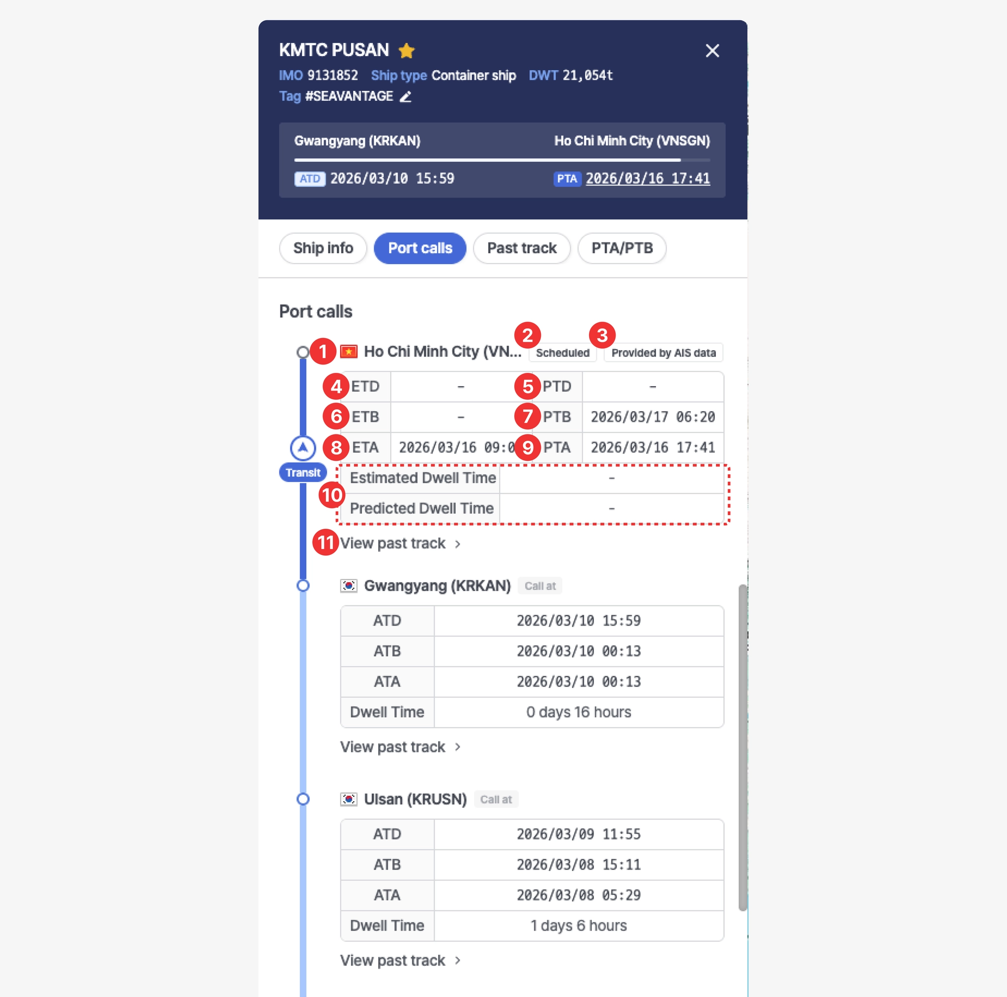 11 | View past track | 클릭하면 지도상 항구별 이동 경로를 확인할 수 있습니다. |