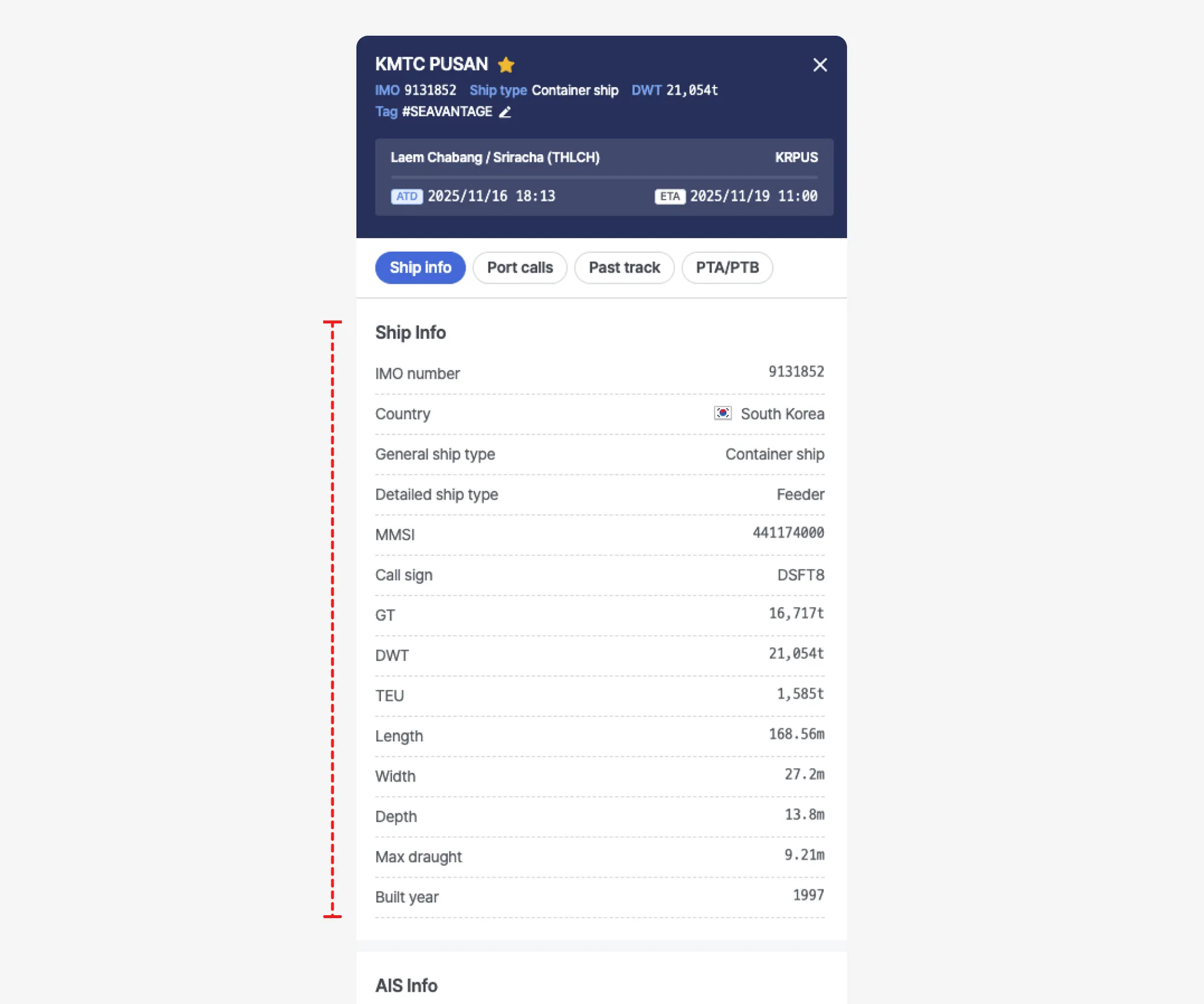 This feature provides a screen where you can view a vessel’s basic specifications (Ship Info) and its real-time operating status (AIS Info).