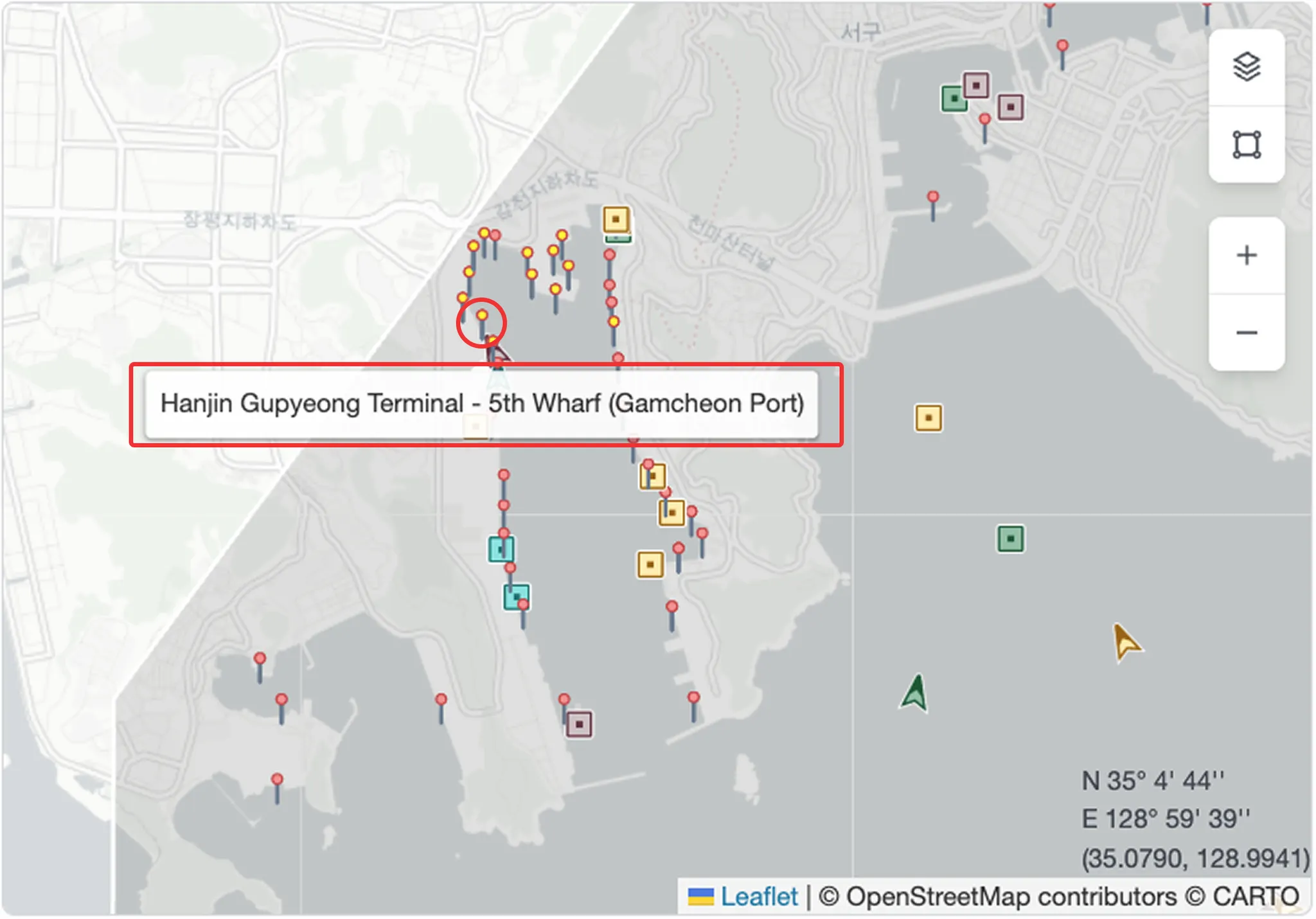 When zooming in, berth locations are displayed in greater detail. Hovering over a berth shows the terminal name.