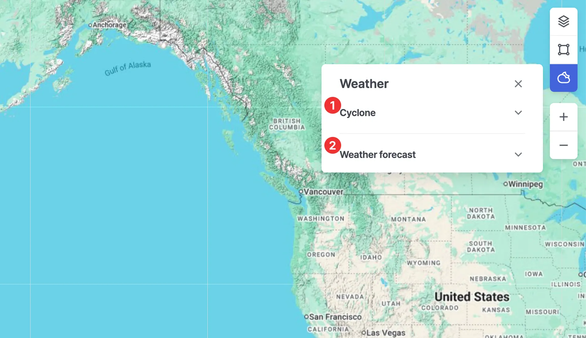Weather forecasts are displayed using 1-degree data by default, 0.5-degree data at zoom levels 6–7, and 0.25-degree data at zoom level 8 or higher.