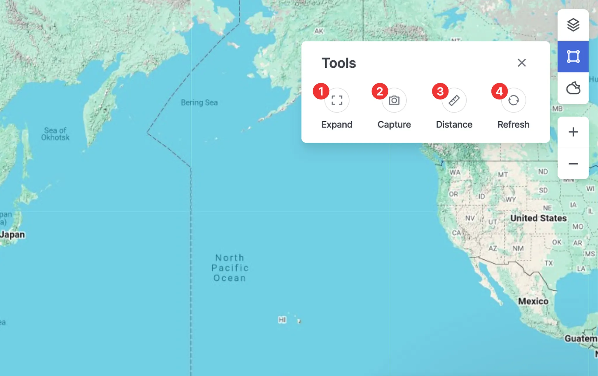 Tools 패널에서는 사용자가 현재 보고 있는 지도 화면을 효율적으로 활용하고 심층적으로 분석할 수 있도록 돕는 기능입니다.