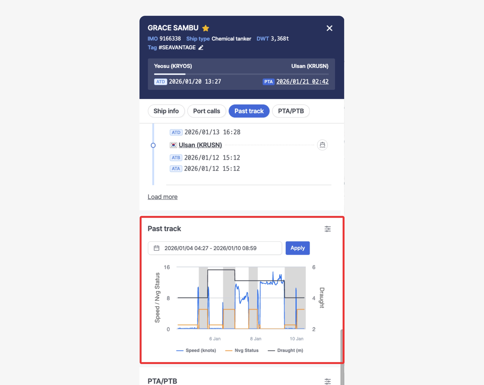 Past Track은 지도에 선박이 운항했던 항적 및 선박의 속도(Speed), 항해 상태(Navigation Status), 그리고 흘수(Draught) 변화를 시간대별로 시각화하여 보여주는 기능입니다.