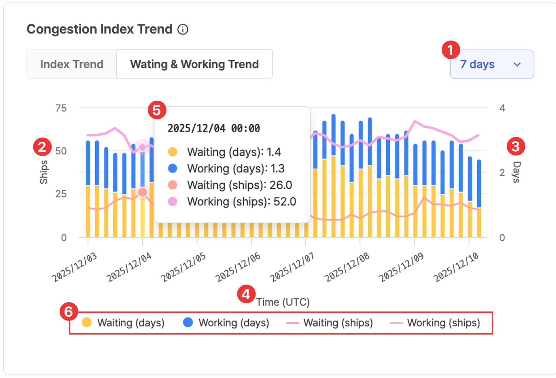 Port insight > Congestion Index Trend > Waiting & Working Trend에서 7일을 조회한 화면