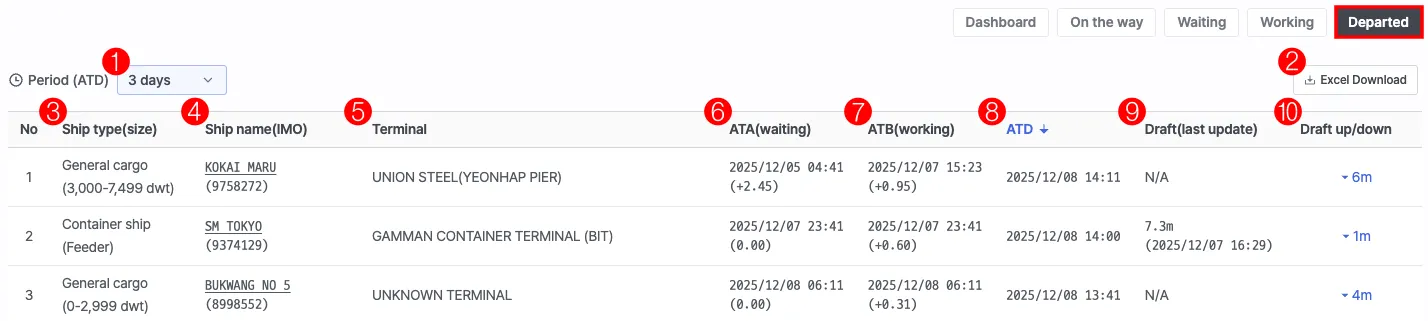 상단의 Departed 탭을 클릭하면 출항 완료 선박 목록을 표시하며, 선박 도착 및 접안, 출발 정보 (ATA, ATB, ATD)를 확인할 수 있으며.