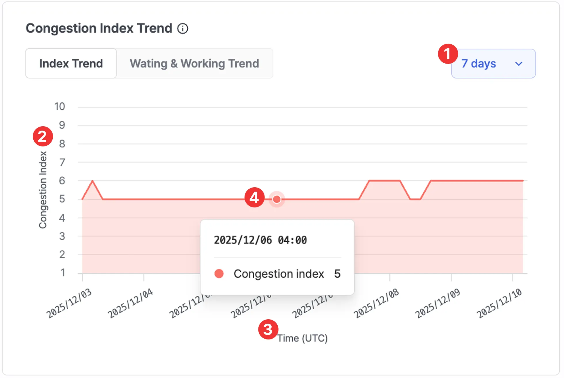 실시간 평균 혼잡도 대비 현재 시점의 혼잡도를 1~10 구간으로 수치화한 지표입니다. 수치가 높을수록 항구 내 선박 대기나 정체가 심한 상태를 의미합니다.