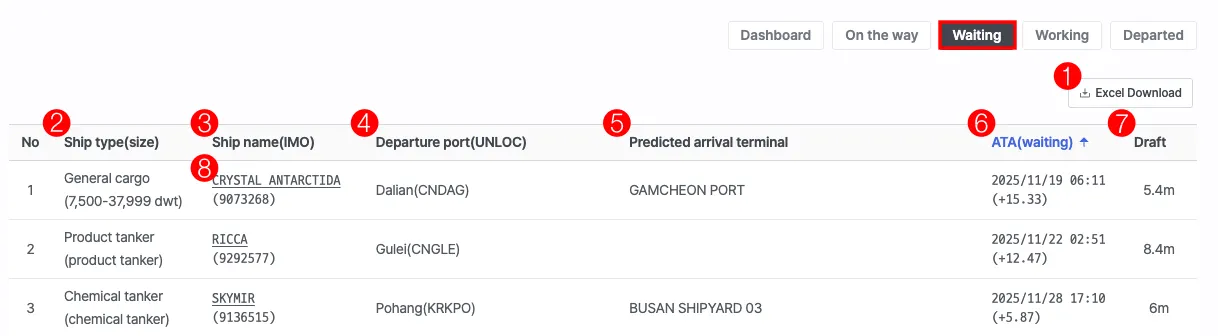 Clicking the Waiting tab opens the list of vessels currently waiting, including detailed ATA information.