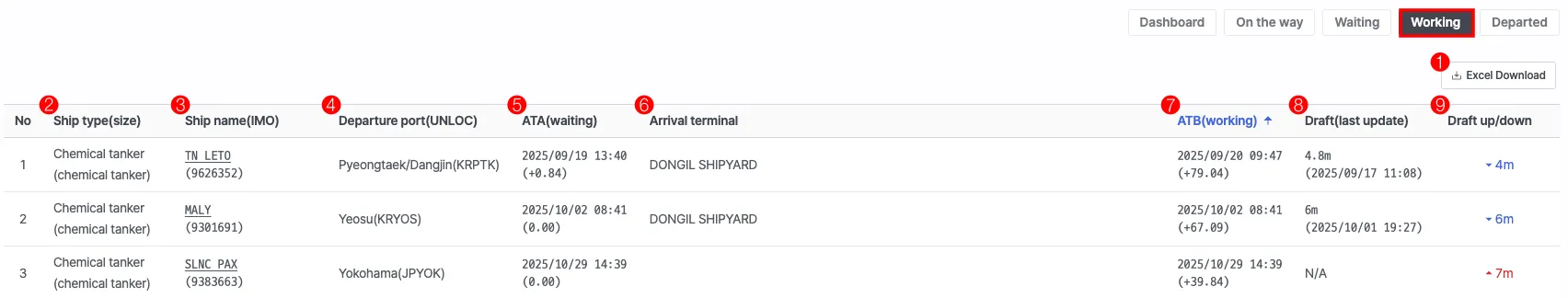 Clicking the Working tab displays the full list of berthed vessels with ATA/ATB details.