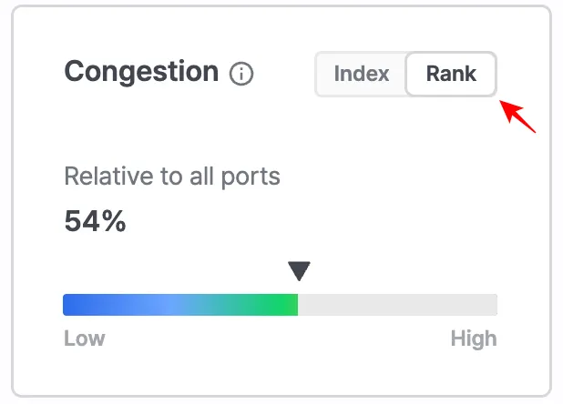 Index: Shows the current congestion level compared to historical patterns for the selected port. Data updates every 15 minutes.